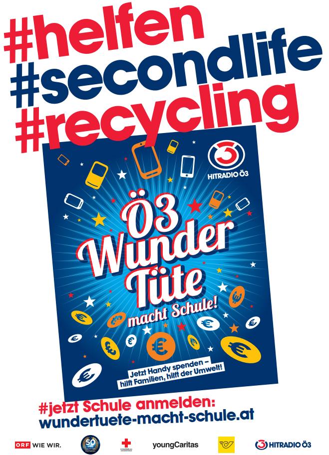 Wir haben eine Mission und ein Ziel – und hoffen auf Ihre Unterstützung: Kein Handy oder Smartphone soll in der Schublade vergammeln! Warum? Weil Handys und Smartphones keine Wegwerfprodukte sind, sondern wertvolle Ressourcenträger. Und wenn sie kaputt sind oder es einfach ein neues sein muss, dann sollten wir sie eben nicht in der Schublade vergammeln lassen und schon gar nicht in den Restmüll werfen. Deswegen laden wir im Rahmen der Handysammelaktion „Ö3-Wundertüte“ alle Schulen in ganz Österreich zu einer gemeinsamen Challenge ein. – Ö3