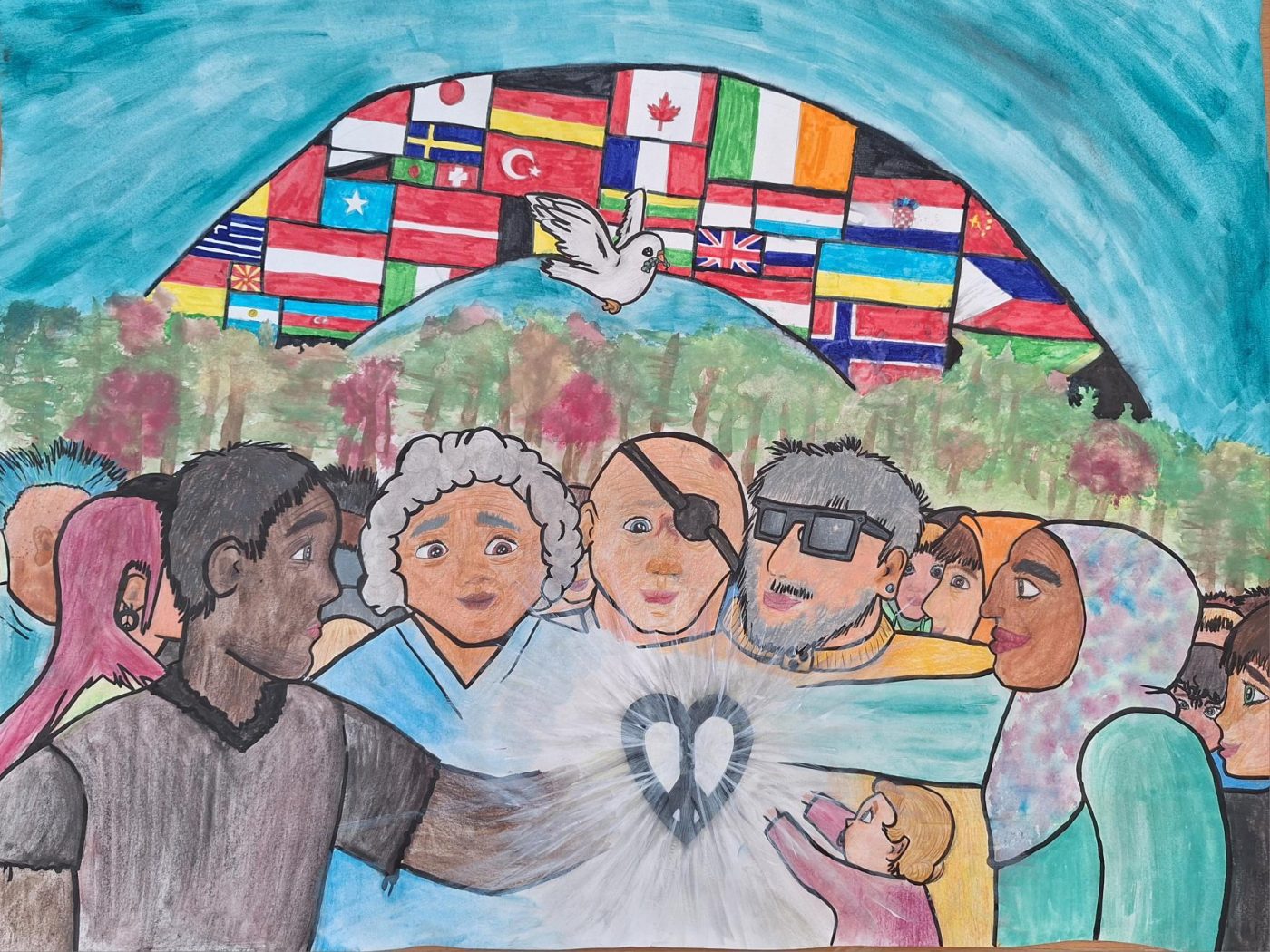 Timo Schwabeneder aus der 2b wurde mit diesem beeindruckenden Werk diesjähriger Schulsieger des Friedensplakat- Malwettbewerb, bei dem insgesamt 76 Schüler*innen der 2. Klassen teilnahmen. Organisiert wurde dieser internationale Bewerb vom Lionsclub. Timos Chancen stehen gut, auch auf Landes- und Bundesebene weiter zu kommen.